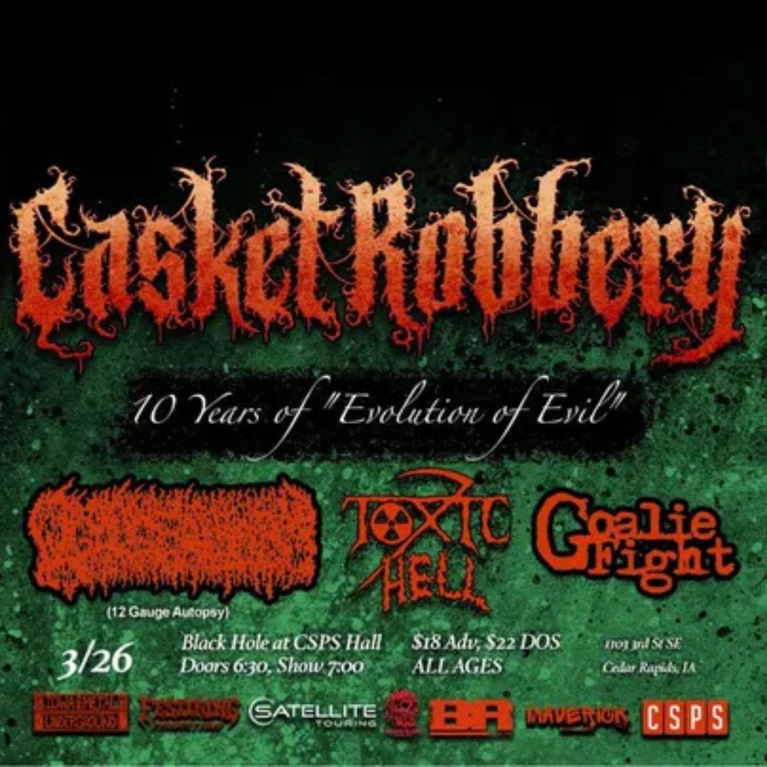 Presented by Iowa Metal Underground and Festering Productions, Casket Robbery from Madison, Wisconsin will be celebrating 10 years of their album, "Evolution of Evil".