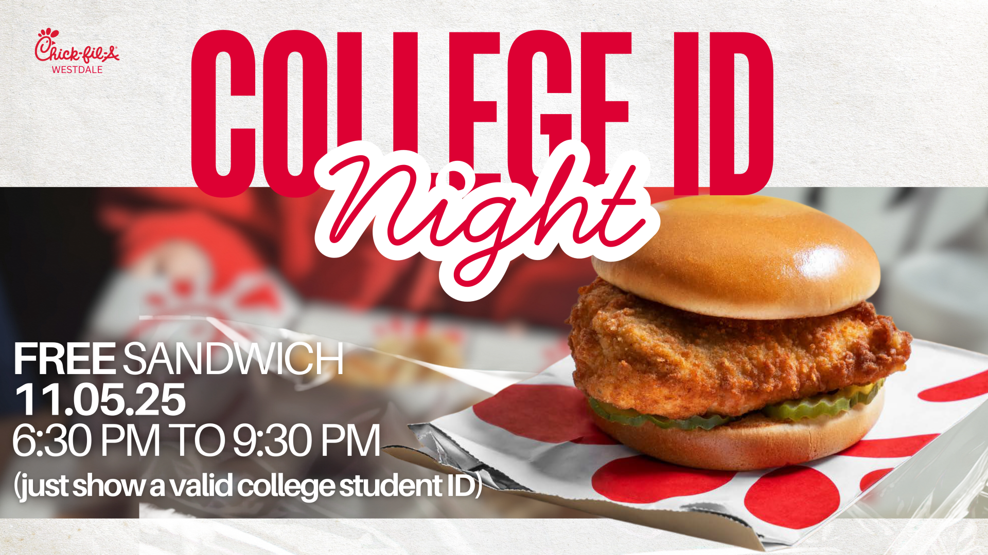 Join us for College ID Night on Wednesday, November 5 from 6:30 to 9:30 p.m. at Chick-fil-A Westdale in Cedar Rapids. This event is designed just for local college students to relax, connect, and enjoy a night out together.