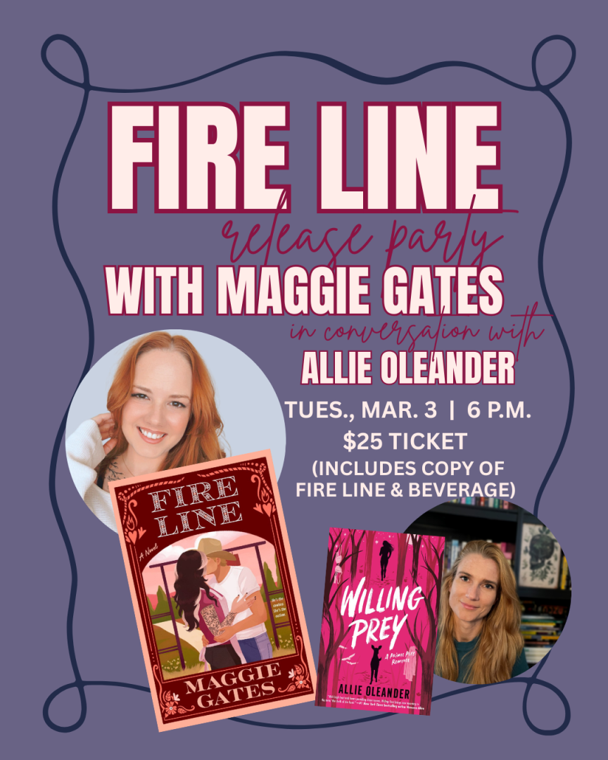 Allie will lead Maggie in a question & answer session regarding her series, future release plans and more. Following the Q&A, both authors will be available for a book signing & meet-and-greet. Tickets to the event are $25 and include a copy of Fire Line, along with a beverage. There will be additional books on site for sale that night.