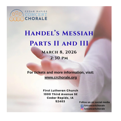 Don’t miss a very special performance as the Cedar Rapids Concert Chorale presents Handel’s Messiah Parts II and III, on March 8 at 2:30 pm at First Lutheran Church in Cedar Rapids.