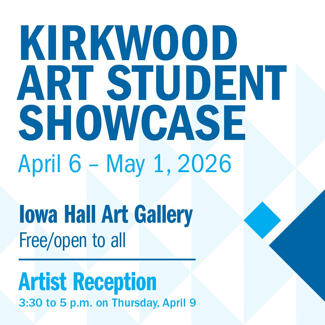 A reception celebrating their work will be held on Thursday, April 9, from 3:30-5 p.m. in the Iowa Hall Art Gallery. The reception is free and open to the public and will feature refreshments. Please join us to celebrate our Kirkwood students!