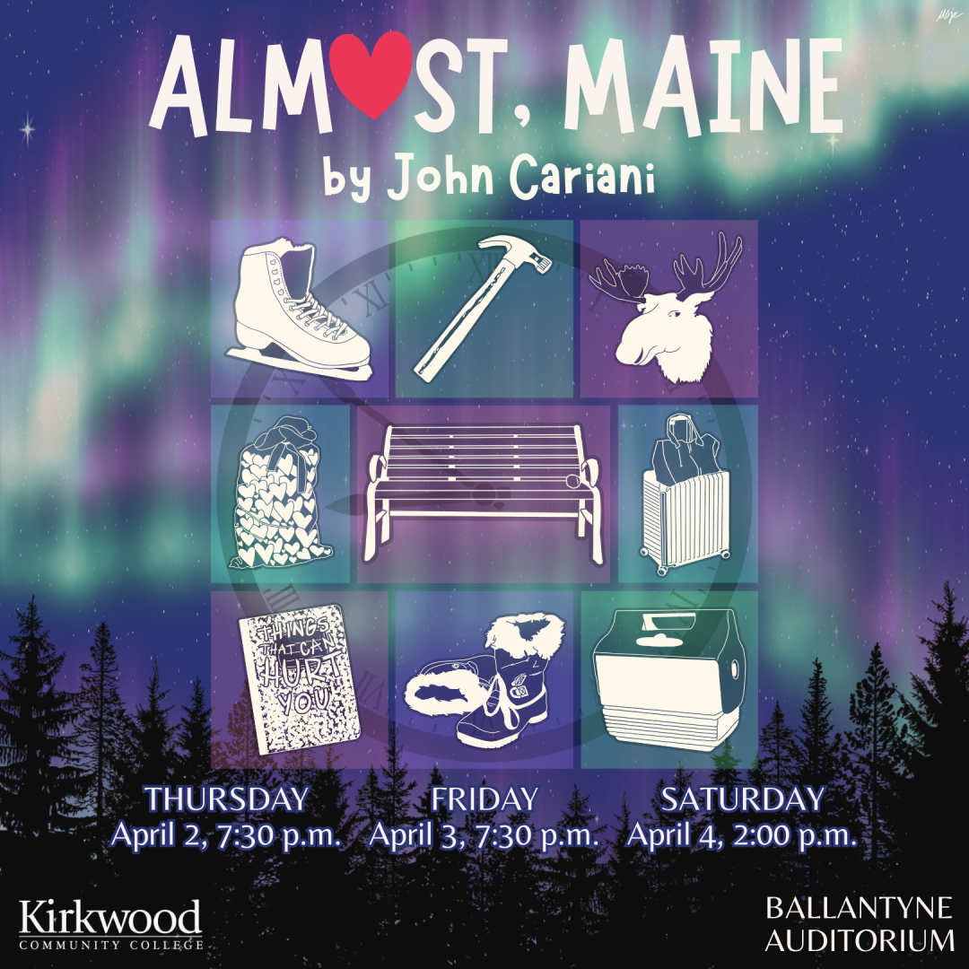 🎭 Join us for Kirkwood Community College's spring play, “Almost, Maine”! Beneath the northern lights, the residents of a remote, almost-forgotten town discover the wonder, humor, and heartbreak of love in nine interwoven stories unfolding on one magical winter night. Written by John Cariani, this heartfelt comedy celebrates connection, hope, and the beauty of “almost.”