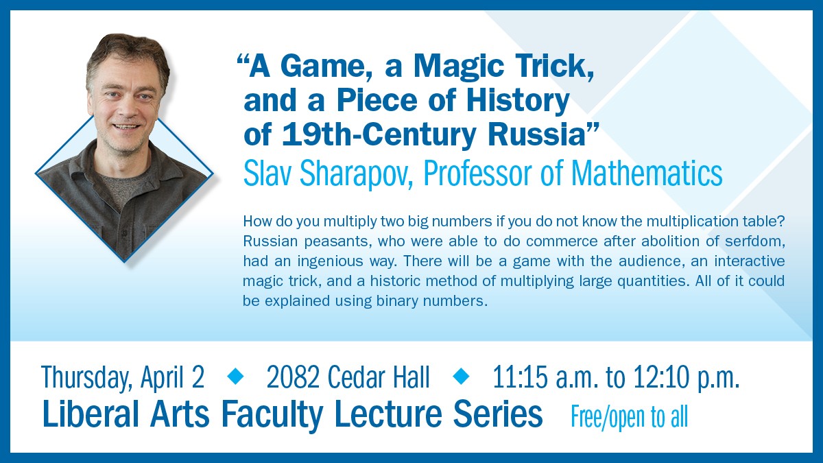 Come to the final Kirkwood Community College Liberal Arts Faculty Lecture of the year on Thursday, April 2, featuring Slav Sharapov, Professor of Mathematics at Kirkwood! Sharapov will present: "A Game, a Magic Trick, and a Piece of History of 19th Century Russia." Join us at 11:15 a.m. in 2082 Cedar Hall on Kirkwood Community College's main campus in Cedar Rapids. This event is free and open to the public.