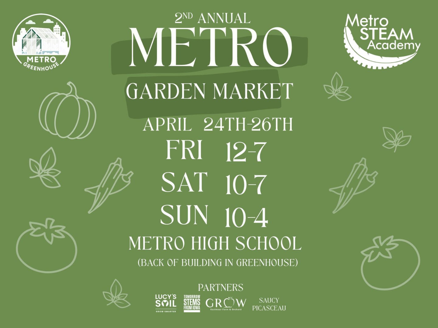 Metro Garden Market partners include Lucy’s Soil, Tomorrow STEMS from Iowa, Saucy Picasceau and GROW Kazimour Farms & Orchard. Some vendors will be at the market on Saturday, April 25.