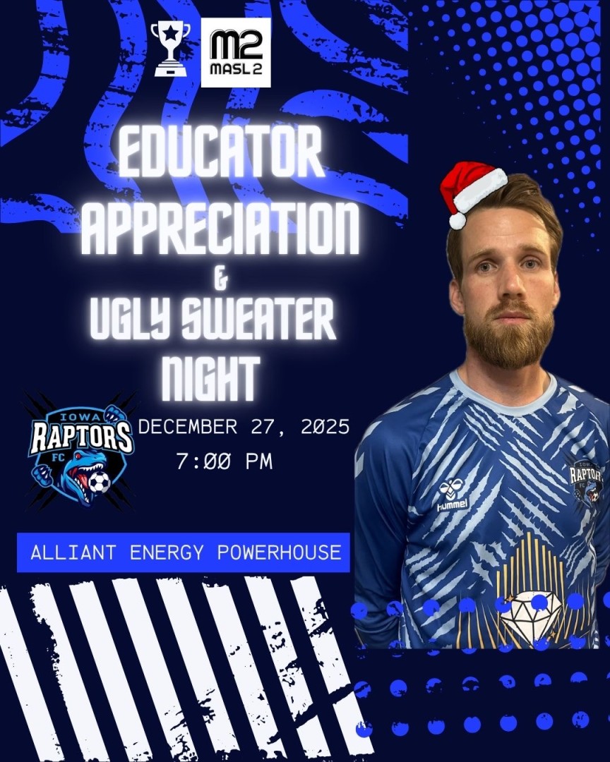 An exciting indoor soccer doubleheader! The Lady Raptors (0-1) look to rebound against the Omaha Queens after a tough loss to the Kansas City Astas on December 6, while the Raptors' men's side (1-0) look to build on their winning ways after a dramatic last-minute victory over the Minnesota Blizzard. One ticket buys admission to both games. It's also our Salute to Educators night -- present a valid school ID at the box office to receive 25% off! Plus Ugly Sweater Contest -- wear your ugliest Christmas sweater; the winner will receive a free chuck-a-ball!