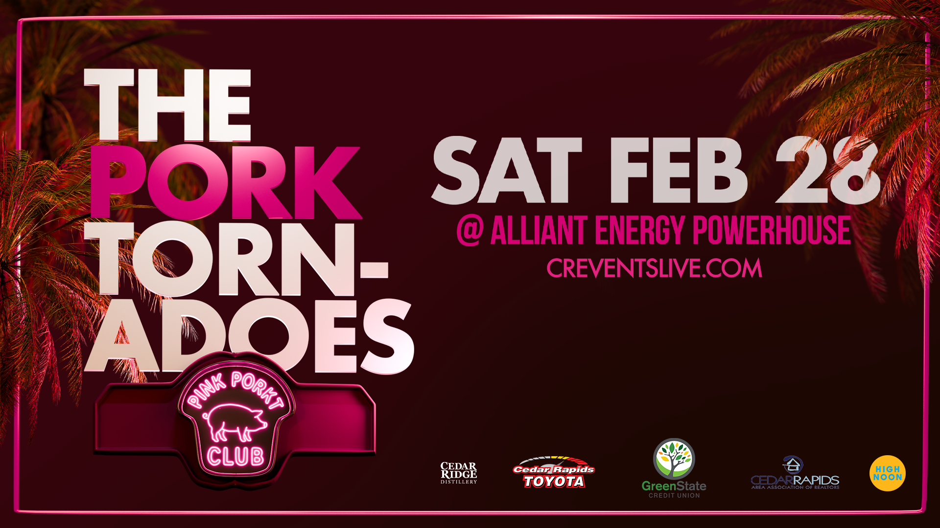 The Pork Tornadoes return to Cedar Rapids on Feb 28th for their biggest local show to date! Celebrating their 18th anniversary, the band will be bringing new songs and an even bigger party to the Alliant Energy Powerhouse. Grab tickets now to see the Midwest's most popular party band. The Pork Tornadoes captivate audiences with their signature spin on hits spanning five decades and multiple genres. With over 800 shows performed for more than 1.5 million fans, they’ve built a reputation for high-energy performances and unexpected song choices that keep crowds dancing all night. From Taylor Swift, Katy Perry, and NSYNC to The Killers, Lizzo, Morgan Wallen, and Phil Collins, The Pork Tornadoes bring an electrifying mix of pop, rock, country, and hip-hop that appeals to music lovers of all ages. Their debut EP soared to #20 on the Apple iTunes Pop charts, racking up over 3 million streams, while their viral cover of Tennessee Whiskey became the 4th-most viewed version online. They’ve also been featured in Rolling Stone for their powerful rendition of In The Air Tonight. With 30 million+ video views and 125,000+ social media followers, come see why you have been hearing people talk about The Pork Tornadoes for nearly 2 decades.