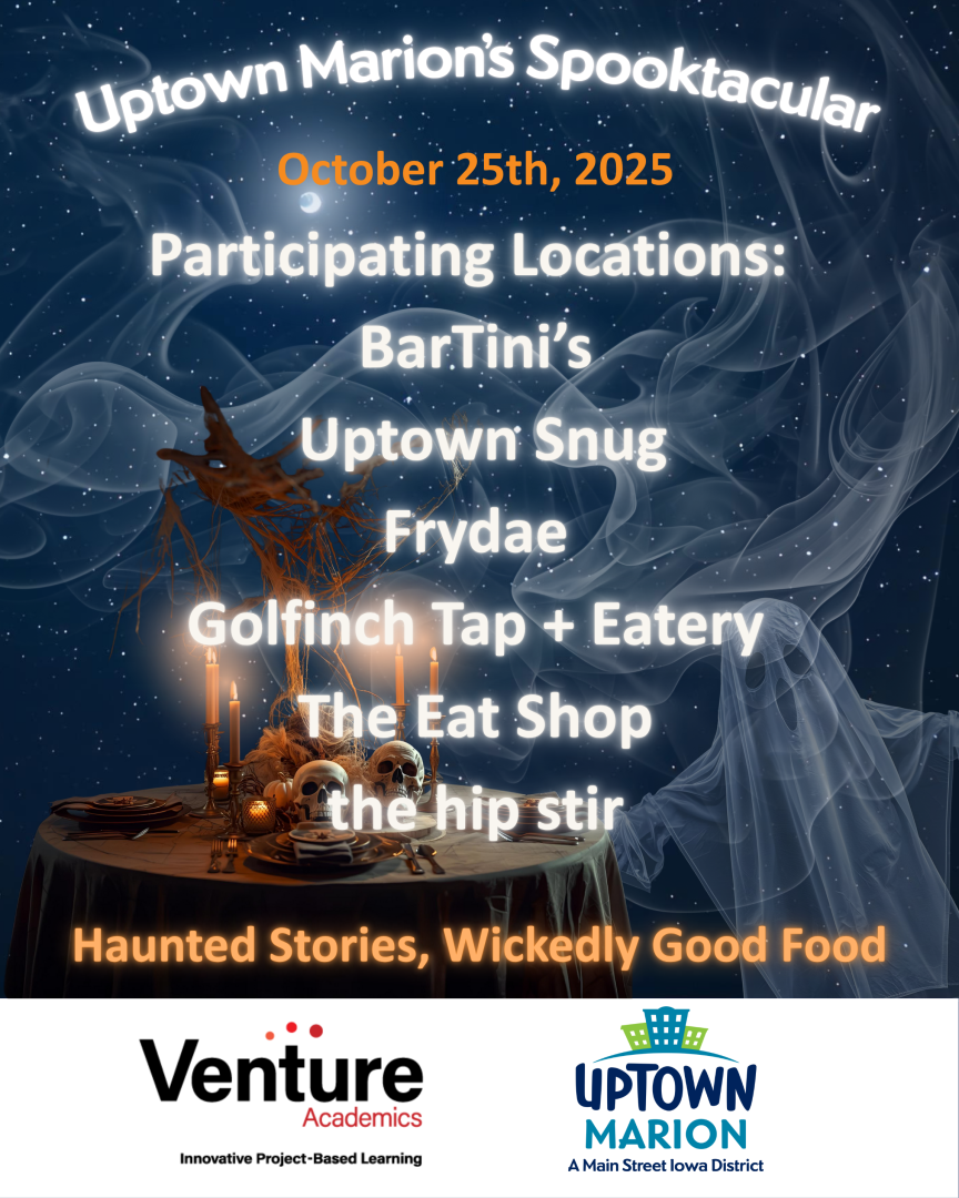 Step into the spirit of the season with the Uptown Marion Spooktacular, a free community event that brings a touch of Halloween magic to your favorite Uptown spots. Enjoy haunted stories crafted by Linn-Mar Venture Academics Creative Writing students, along with wickedly good food and BOOes from local businesses.