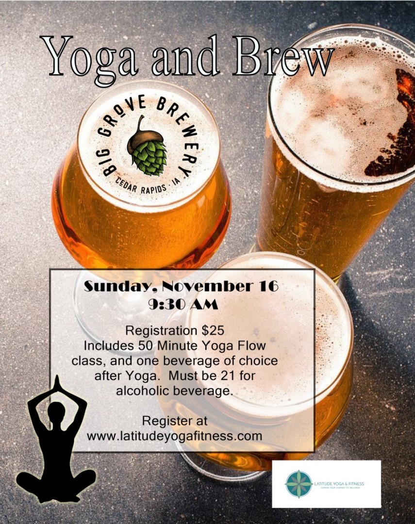 Enjoy a 50 minute yoga class at Big Grove Brewery and Tap room. Then enjoy a beverage of choice from the tap. This event includes yoga and 1 beverage. Stick around and socialize after class.